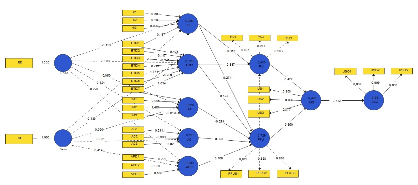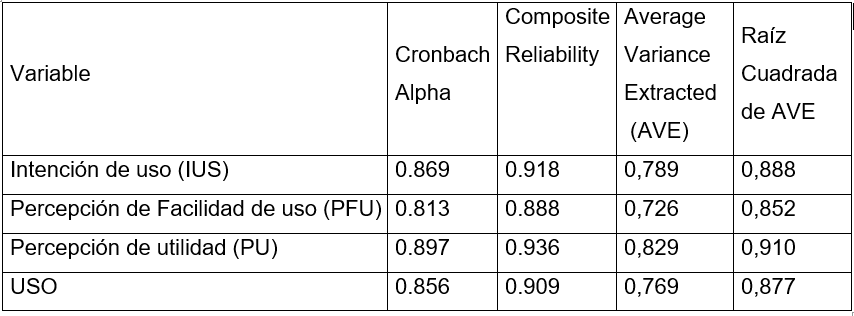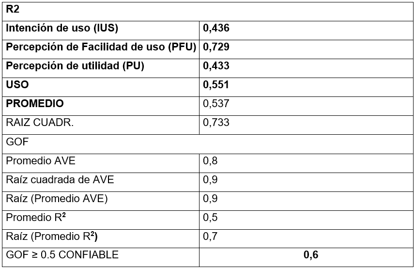 Fase 3. Valoración del modelo estructural: todos los R2 obtuvieron puntuaciones R>0,1 indicando que la cantidad de la varianza de la variable endógena USO fue explicada por los constructos que la predicen obteniendo un nivel predictivo alto y estadísticamente significativo. El ajuste global arrojó un Gof 0,6 ≥0.5, mostrando un buen ajuste global del modelo de investigación (ver tabla 2).