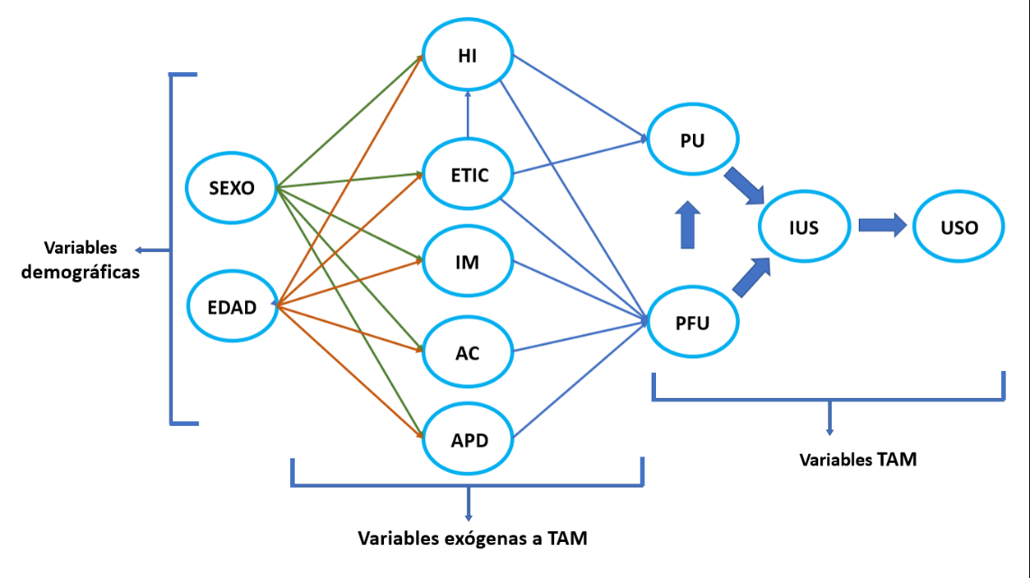 Hipótesis nula (H0): las variables TAM: Percepción de facilidad de uso (PFU), Percepción de utilidad de uso (PU), e Intención de uso (IUS); las variables exógenas al modelo TAM: Habilidades Informacionales (HI), Entrenamiento en TIC (ETIC), Importancia (IM), Acceso (AC) y Actitud y preparación docente (APD) y las variables demográficas: Sexo y Edad, no influyen en la aceptación y uso de las TIC en el proceso de enseñanza-aprendizaje por parte de los docentes analizados.
