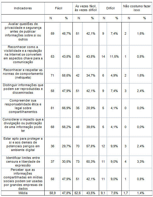 Assim, a análise é primordialmente quantitativa, utilizando-se de médias estatísticas simples para destacar os dados mais relevantes. Os dados são apresentados em tabelas. Esses dados são interpretados à luz de teoria e de outras pesquisas no campo do comportamento e das competências infocomunicacionais, conduzindo aos resultados apresentados na próxima seção.