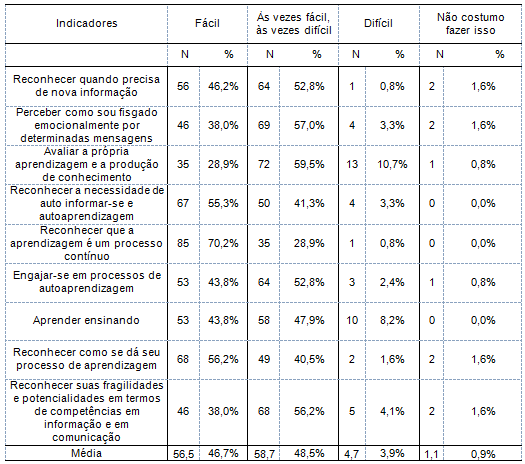 De outra parte, nem sempre é fácil (59,5%) avaliar a própria aprendizagem e a produção de conhecimento; para outros 10,7% isso é especialmente difícil. Por isso a abordagem inerente ao conceito de Metaliteracy é apropriada neste estudo, porque destaca a importância de que cada sujeito desenvolva autonomia frente à sua aprendizagem, a ponto de definir o que precisa aprender, como aprende melhor, por que realmente tal aprendizagem é importante. Buscar o conhecimento sobre si, seu processo de aprendizagem peculiar e o que constrange ou impulsiona o desenvolvimento de competências é um comportamento ainda pouco presente entre os entrevistados, mas cada vez mais necessário sob a égide de uma sociedade baseada no conhecimento.