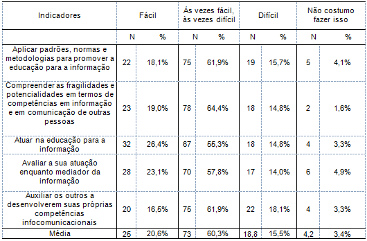 Todavia, para 64,4% dos respondentes nem sempre é fácil compreender as fragilidades e potencialidades em termos de competências em informação e em comunicação de outras pessoas; e para 18,1% é difícil auxiliar os outros a desenvolverem suas próprias competências infocomunicacionais. Assim, se de um lado há clareza quanto à necessidade e oportunidade de promover competências infocomunicacionais entre as pessoas, os resultados apontam que os profissionais e estudantes de biblioteconomia ainda não sabem como fazê-lo.