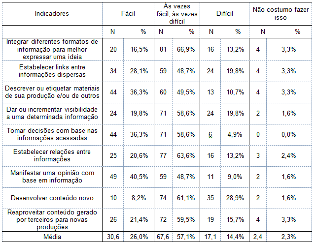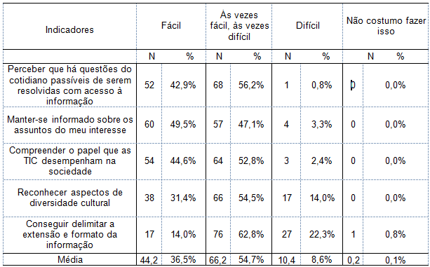 A terceira categoria de questões diz respeito ao comportamento infocomunicacional propriamente dito. Tratam-se de 11 blocos temáticos, dentro dos quais foram propostas ações para as quais os sujeitos posicionaram-se em quatro opções: (1) Não costumo fazer isso ou nunca me preocupei com isso; (2) Considero essa atividade difícil; (3) Às vezes essa ação é fácil, outras difícil; (4) Considero essa atividade fácil. Para analisar tais questões foram desenvolvidas tabelas para cada bloco.