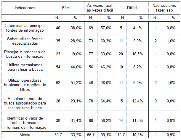 No segundo bloco (Tabela 2) procura-se compreender como as pessoas buscam a informação, e as dificuldades e facilidades que encontram no processo. A principal facilidade é utilizar operadores booleanos e opções de filtros, mas apenas para metade das pessoas (51%), porque para 64,4% às vezes é difícil escolher termos de busca apropriados para realizar uma busca; e para 16,5% é difícil planejar o processo de busca de informação como um todo, determinando fontes, sistemas, estratégias e termos de busca adequados ao acesso à informação. Em síntese, mesmo para profissionais da informação, nem sempre é fácil lidar com sistemas de informação e seus mecanismos de busca, evidenciando a necessidade de formação continuada mesmo em aspectos mais técnicos da profissão. A necessidade de construir estratégias de busca significativas também se coloca pelo excesso de informação. Muitos são os resultados em uma busca, e o ato de desinformar pode decorrer da ansiedade informacional (Wurman, 1999) ao não saber julgar a informação mais adequada para o momento. E para lidar com o excesso de informação uma das soluções é desenvolver competências para filtrar a informação através de boas estratégias de busca.