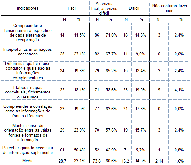 Quanto à compreensão, organização e síntese da informação (terceiro bloco), observa-se novamente a dificuldade com sistemas e ferramentas de acesso à informação, pois para 71% às vezes é difícil compreender o funcionamento específico de cada sistema de recuperação de informação (Tabela 3). Também chama a atenção que quando se trata de interpretar as informações acessadas, a maioria enfrenta certas dificuldades no processo (67,7%). Isso porque interpretação e uso da informação estão diretamente ligados à apropriação, pois só efetivamos esse processo quando damos sentido, quando significamos a informação (Perrotti & Pierruccini, 2007). No Brasil, onde 22% da população adulta é considerada analfabeta funcional (Índice de Alfabetismo Funcional, 2021), a promoção de competências para compreensão de conteúdos se sobressai como uma necessidade premente.