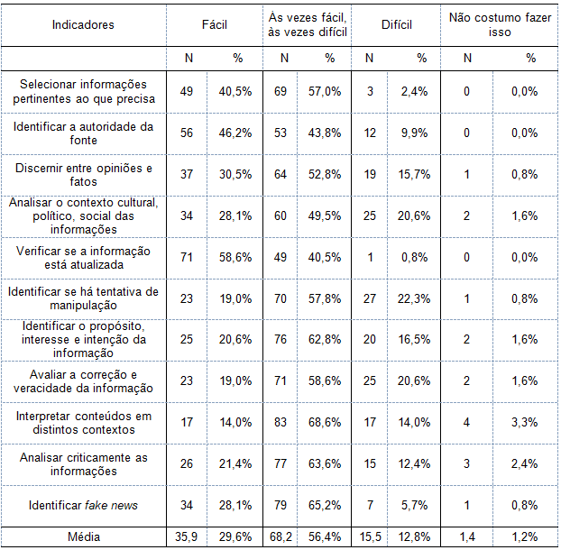 O mais difícil é identificar se há tentativa de manipulação (22,3%) (Tabela 4). De fato, a análise cognitiva da informação requer um conhecimento prévio do assunto, análise do contexto e comparação entre fontes diversas, demandando significativo esforço para determinar se há tentativa de distorção ou manipulação. Também interpretar conteúdos em distintos contextos, a fim de determinar o valor da informação para cada situação particular é identificado como algo às vezes fácil, mas às vezes difícil para 68,5% dos sujeitos. Neste ponto, uma vez mais transparece a questão da avaliação crítica da informação e a subjetividade envolvida. Pela mesma razão, o aspecto mais fácil de averiguar para os respondentes é a atualidade da informação (58,6%), uma vez que checar a data da notícia ou de uma postagem é um elemento objetivo de averiguação. Em termos gerais, contudo, observa-se que há um comportamento consolidado de sempre avaliar a informação, pois menos de 3% disseram não se preocupar com a checagem de conteúdos. Pode-se afirmar, portanto, que bibliotecários e estudantes de biblioteconomia sujeitos desta pesquisa entendem que é seu papel posicionar-se frente às escolhas informacionais e portam-se com responsabilidade realizando a apuração dos conteúdos, ainda que com algumas dificuldades, como as apontadas acima.