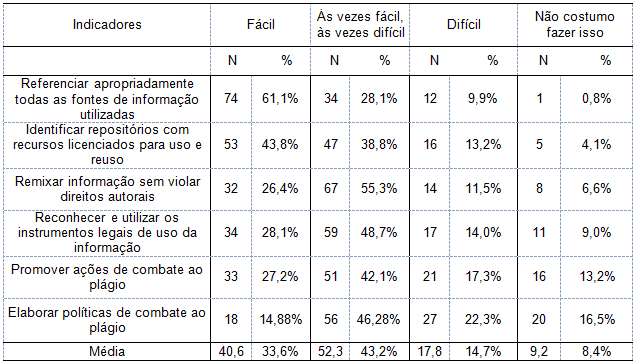 Outros 22,3% ainda consideram difícil tomar iniciativas dessa natureza. Em outras palavras, a área biblioteconômica costuma aplicar as normas, mas tem dificuldade de atuar num dos aspectos mais latentes da infoeducação, que é desenvolver políticas ou iniciativas para que o público saiba usar a informação de forma apropriada, correta e ética, sem incorrer na prática de plágio, por exemplo, tão recorrente na atualidade.