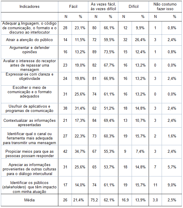 Para 73,5% dos respondentes nem sempre é fácil argumentar e defender opiniões; e para 12,3% isso é declaradamente difícil. Aqui reside um dos elementos fundamentais de atuação do bibliotecário porque sendo uma profissão cuja atividade fim é social, de prestação de serviços e atuação com o público, a demanda pela capacidade de organização de argumentos é cotidiana e presente em diversos momentos: na reunião com a diretoria e defesa de mais recursos para a biblioteca, no atendimento ao público e educação para o uso da informação, no relacionamento com os colegas e articulação entre as demandas das pessoas com os objetivos da unidade de informação; são apenas alguns dos exemplos em que este comportamento proativo é demandado.