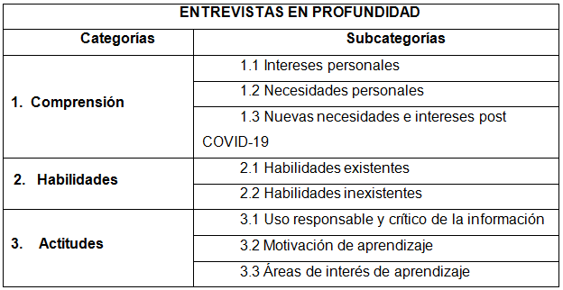 A continuación, se describen las tres categorías proporcionando una explicación del significado, enfoque y descripción de las necesidades e intereses informativos y cotidianos que experimenta cada persona; adicionalmente, se agregan citas textuales que ilustran y clarifican el análisis.