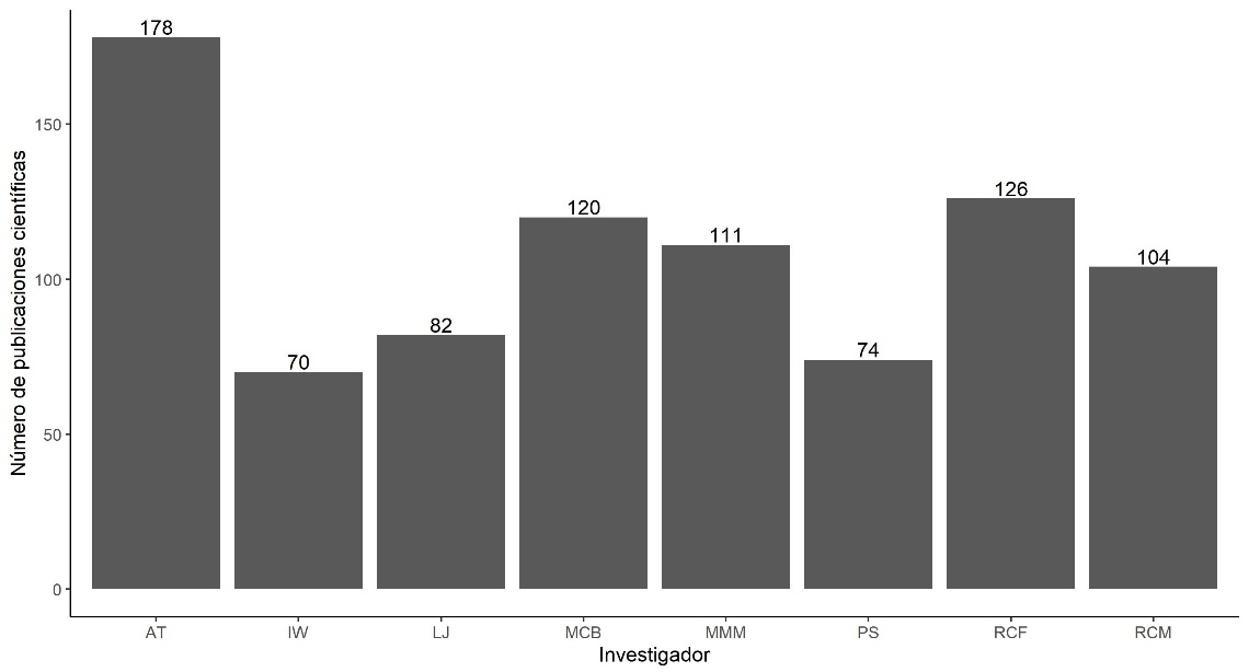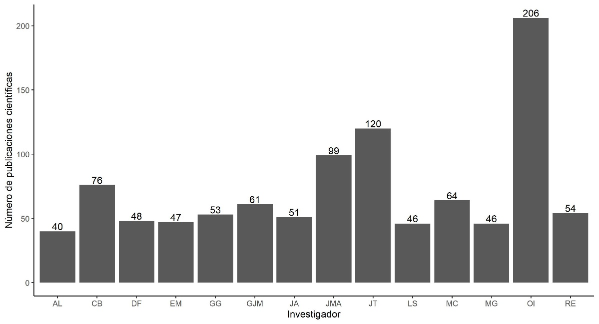 Los investigadores más productivos en el contexto de este estudio, se refieren a los investigadores con mayor número de trabajos publicados en revistas científicas indizadas en Scopus respecto a sus pares investigadores del mismo centro. Para determinarlo, se realizó la sumatoria de todos los artículos publicados de todos los investigadores por cada centro, y el resultado se dividió por el número de investigadores que lo conforman. Aquellos investigadores que se encontraron por sobre la media global fueron considerados como los más productivos. En total, se identificaron 57 investigadores más productivos entre los cuatro centros; 5, 7, 14 y 31 para el Centro i~mar, IOUSP, IICYM y CICESE, respectivamente. La producción científica de los 57 investigadores se evaluó mediante el número de publicaciones acumuladas indexadas en Scopus durante los 20 años. Se recopilaron un total de 3.364 publicaciones científicas para los cuatros centros, con un registro de 227, 865, 1.011 y 1.261 artículos para el Centro i~mar, IOUSP, IICYM y CICESE, respectivamente. Las citaciones se evaluaron considerando el número total acumulado de citas recibidas durante el mismo período, dando un registró total de 60.515 citas para todos los Centros, repartidos en 7.292, 13.703, 14.625 y 24.895 para el Centro i~mar, IOUSP, IICYM y CICESE, respectivamente. Finalmente, las redes de colaboración se evaluaron mediante la cantidad total de artículos entre cada investigador más productivo también con sus respectivos cinco primeros colegas-investigadores (externos o no de cada CIM) con los que más publican.