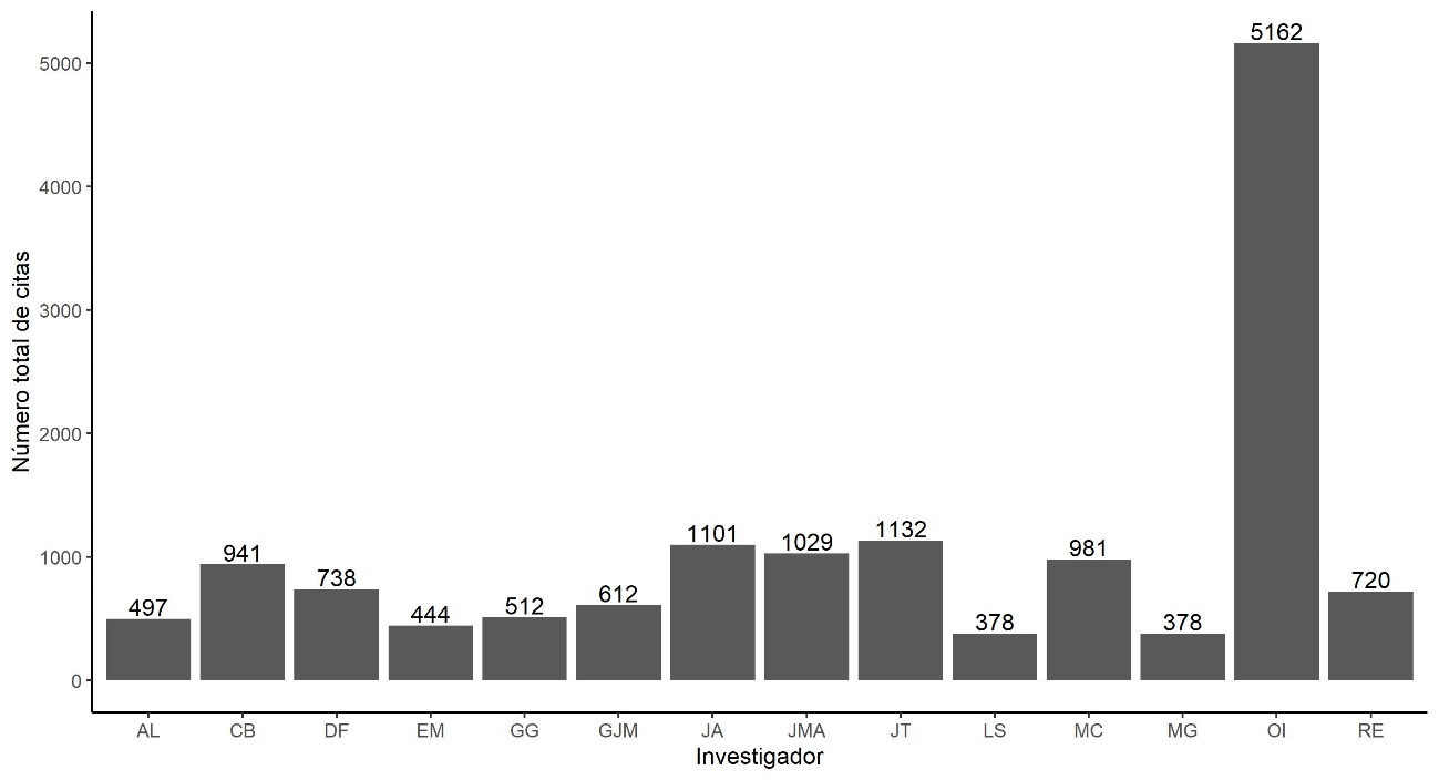 Dentro del Centro i~mar, el investigador con mayor número de citas recibidas por todos sus trabajos fue (AB) con un total acumulado de 5.307 citas (Figura 2a), siendo el año 2019, en el que recibió mayor número de citas (719 citas) (datos no mostrados). Para el IOUSP, fue (MCB) con un total de 2.562 citas (Figura 2b). En el IICYM, el investigador (OI), fue el que registró una mayor cantidad de citas con un total de 5.162 (Figura 2c). Para el CICESE, resultó ser (JC) con 2.590 citas a lo largo del periodo analizado (Figura 2d).