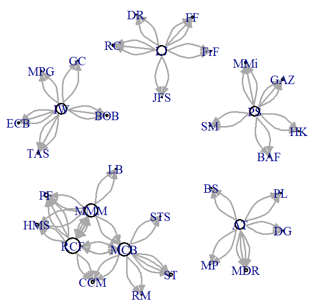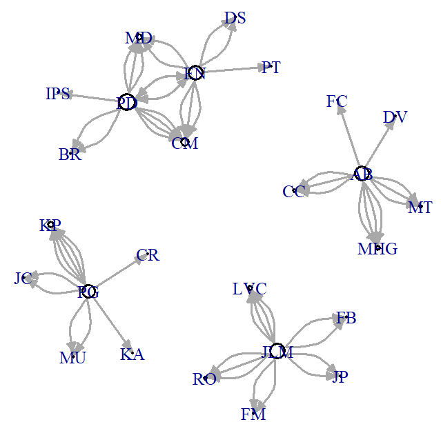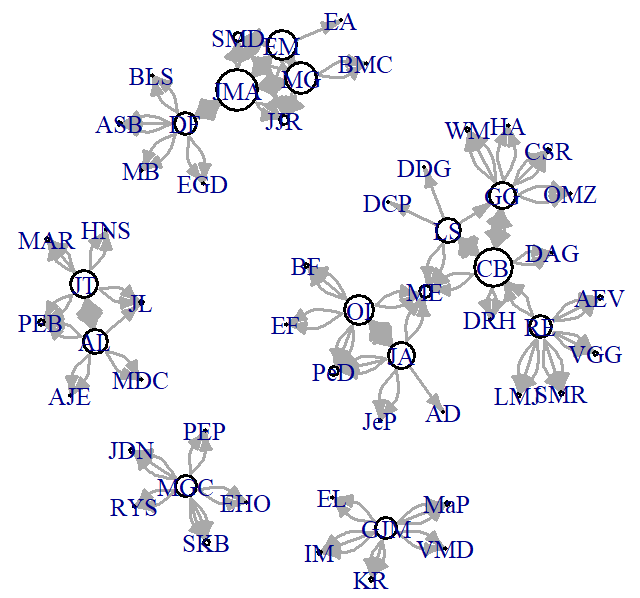 De acuerdo a las redes de colaboración del Centro i~mar (Figura 3a), se observó cuatro grupos bien diferenciados, en donde investigadores como (PD) y (EN) colaboran mutuamente entre sí, y poseen ambos, dos colegas externos en común con quienes se integran y a la vez extienden la red. Por su parte, investigadores como (AB), (PG) y (JLM) poseen su propia red de colaboradores sin integración mutua entre ellos. En el caso del IOUSP (Figura 3b), se pueden notar cinco grupos diferenciados dentro de su red, con una ligera mayor integración entre investigadores del mismo centro. Por ejemplo, (MCB), (MMM), y (RCF) colaboran fuertemente entre sí, lo que permite extender su red mediante colegas externos en común. Cabe destacar que investigadores como (AT), (IW), (LJ) y (PS) manejan su propia red, sin integración con sus pares del mismo centro. Por su lado, en el IICYM (Figura 3c) se pueden evidenciar cinco grupos bien diferenciados, con una notable integración entre sus investigadores. Tal es así que (OI), (LS), (GG), (CB), y (RE) poseen una estrecha colaboración entre sí formando un solo grupo que permite extender la conexión con otros colegas externos en común. Investigadores como (JMA) con (DF), y (JT) con (AL) también cooperan entre sí, aunque en menor grado. Otros como (MC) y (GJM) manejan su propia red de colaboración sin integración con colegas de su propio centro. Finalmente, para el CICESE (Figura 3d), se refleja la mayor cohesión, integración y colaboración entre sus investigadores formado 4 grupos de colaboración. Por ejemplo, los investigadores (MPS) y (TC) manejan su propia red, aunque colaboran mutuamente entre sí, mediante un par externo en común. En esta red, resalta una estrecha colaboración entre varios investigadores como (AR), (JCM), (MP), (LC), (FD), (CEG) y (BL). Cabe destacar que en este centro el 54.8%, es decir 17 de los 31 investigadores trabajan colaborativamente entre ellos, formando una extensa y compleja red que a su vez se conecta con otros investigadores externos en común.