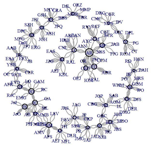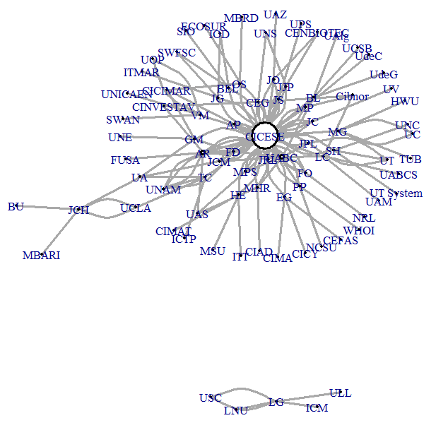 En base al estudio de Leij & Goyal (2006), una red central está formada sólo por un pequeño grupo de investigadores muy productivos. Newman (2004), demostró que los investigadores con muchos vínculos en su red tienden a colaborar con otros investigadores que a su vez también poseen grandes redes de colaboración. Aunque en nuestra investigación se consideraron solamente los cinco primeros colegas-investigadores (que bien pueden pertenecer o no a los CIM) con los que más comparten coautorías los investigadores aquí analizados, nuestros resultados concuerdan con los de Newman (2004), en el sentido de que aquellos autores a su vez tienen una amplia red de colaboración. Tal es el caso del investigador (OI) del IICYM que registra más de 300 colaboraciones en total (datos no mostrados), en donde sus cinco primeros colaboradores poseen a su vez una amplia red con otros pares. Otro caso es del investigador (AB) del Centro i~mar, que registra 345 colaboradores en total en su trayectoria científica, y en donde tres (DV, MT, FC) de sus cinco primeros colaboradores, poseen una gran red de cooperación con sus respectivos pares (>100 cada uno). Esta misma tendencia se repite para el investigador más productivo del CICESE (AR) y el investigador más citado (LJ) donde tienden a colaborar mayoritariamente con otros investigadores con amplias redes de colaboración. Sorpresivamente esta misma tendencia no se repite para el investigador más productivo (AT) del IOUSP, que, aunque cuenta con una amplia red (>421 colaboradores) en su trayectoria científica, sus cinco primeros colegas con los que comparte más coautorías, registran en promedio menos de 50 colaboradores, lo que puede considerarse comparativamente como una baja red de cooperación. Se la califica como baja red de cooperación si se la compara con otros autores del mismo centro como (MMM, MCF y MC) que poseen cada uno >300 colaboradores y que, a su vez, sus principales colaboradores poseen >150 colaboradores. En general, los resultados de estas redes de colaboración sugieren una tendencia en la que los investigadores más productivos de cada CIM tienden a colaborar con otros que poseen también una amplia red de colaboración.
