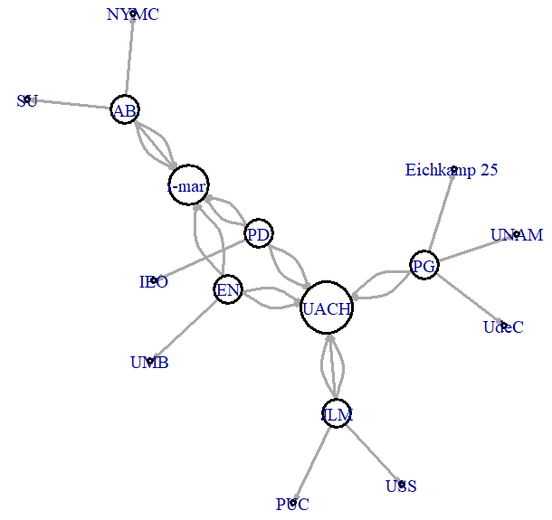 En las redes de colaboración, el tamaño del nodo (círculo) y el número de conexiones (líneas) indican el grado de colaboración existente. Por lo tanto, a mayor tamaño del nodo y número de conexiones, mayor será la colaboración existente ya sea entre investigadores, entre investigadores con otros centros, o entre investigadores de diferentes países. El grado de colaboración depende del número de artículos en coautoría entre un investigador productivo con sus pares, ya sea del mismo centro o de otros centros. Finalmente, este estudio consideró solamente aquellos investigadores que figuran en su centro como investigadores y profesores titulares, asociados y adjuntos, excluyendo de los análisis a aquellos investigadores que figuran como profesores colaboradores o invitados.
