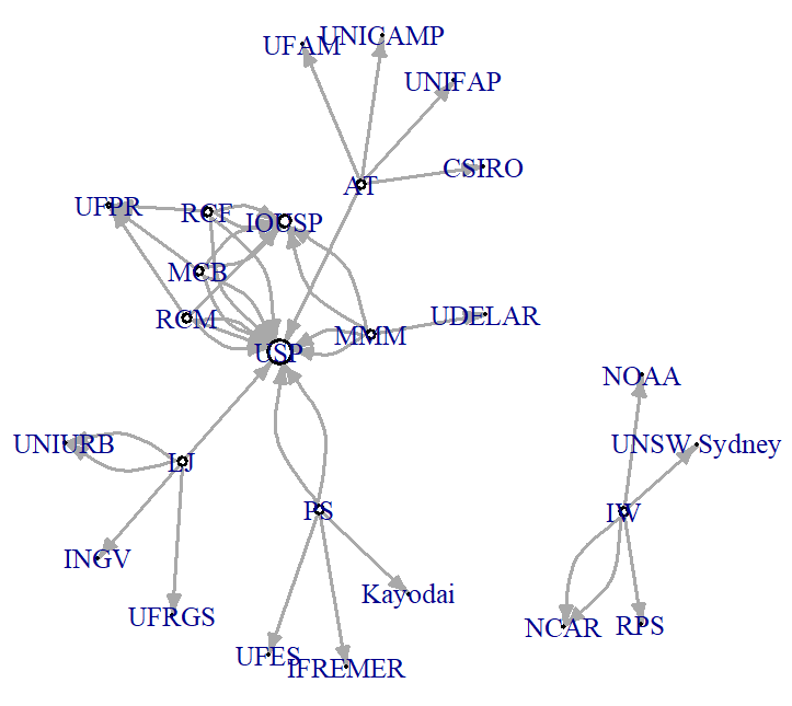 Los investigadores del Centro i~mar trabajan mayoritariamente con investigadores de la Universidad Austral de Chile (UACH) en un 36%, y con investigadores del mismo Centro i~mar en un 28% (Figura 4a). Con un 0.03% colaboran con investigadores del Instituto Español de Oceanografía (IEO), New York Medical College (NYMC), Pontificia Universidad Católica de Chile (PUC), Universidad de Stockholm (SU), Universidad de Concepción (UdeC), Universidad de Maryland (UMB), Universidad Nacional Autónoma de México (UNAM) y Universidad San Sebastián (USS), respectivamente. En el caso de los investigadores del IOUSP, colaboran principalmente con investigadores de la Universidade do São Paulo (USP) en un 32.5%, y del propio IOUSP con un 17.5% (Figura 4b). En un menor porcentaje (12%) con investigadores de la Universidade Federal do Paraná (UFPR), en un 0.03% con investigadores de Universidad de la República (UDELAR), Universidade Federal do Amazonas (UFAM), Universidade Estadual do Campinas (UNICAMP) y Universidade Federal do Amapá (UNIFAP) y con el 0.01% con investigadores del Commonwealth Scientific and Industrial Research Organization (CSIRO), Institut Francais de Recherche pour l'Exploitation de la Mer (IFREMER), Istituto Nazionale Di Geofisica e Vulcanologia (INGV), National University Corporation Tokyo University of Marine Science and Technology (Kayodai), National Center for Atmospheric Research (NCAR), Atlantic Oceanographic and Meteorological Laboratory (NOAA), RPS Group Plc (RPS), Universidade Federal do Espírito Santo (UFES), Universidade Federal do Rio Grande do Sul (UFRGS), Universita degli Studi di Urbino Carlo Bo (UNIURB) y UNSW Sydney. Los investigadores del IICYM colaboran en un 40% con pares del mismo centro, seguido de un 28.6% con investigadores de la Universidad Nacional Mar del Plata (UNMDP), que alberga al IICYM y con un 12.9% con colegas del Instituto Nacional de Investigación y Desarrollo Pesquero (INIDEP) (Figura 4c). Con un porcentaje del 7.1% con investigadores del Consejo Nacional de Investigaciones Científicas y Técnicas (CONICET), y con menos del 3% con investigadores del Centre Eau Terre Environnement (INRS), Museo Argentino de Ciencias Naturales Bernardino Rivadavia (MACN), Universidad de Buenos Aires (UBA), Universidade Federal do Pernambuco (UFPE), Universidade Federal Rural do Rio de Janeiro (UFRRJ) y Universidad de Nebraska–Lincoln (UNL). Finalmente, el 43.9% de los investigadores del CICESE, realizan sus trabajos con colegas del mismo centro, mientras que el 56.2% restante se encuentra repartido hacia otros centros con un porcentaje promedio de cooperación del 1.02% en cada uno (Figura 4d), siendo estos Brown University (BU), Centre for the Environment Fisheries and Aquaculture Science (CEFAS), Centro Biotecnológico del Perú (CENBIOTEC), Centro de Investigación en Alimentación y Desarrollo (CIAD), Centro de Investigaciones Biológicas del Noroeste (Cibnor), Centro Interdisciplinario de Ciencias Marinas (CICIMAR), Centro de Investigación Científica de Yucatán (CICY), Centro de Investigaciones Marinas (CIMA), Centro de Investigación en Matemáticas, A.C (CIMAT), Centro de Investigación y de Estudios Avanzados (CINVESTAV) Unidad Mérida, El Colegio de la Frontera Sur (ECOSUR), Flinders University (FUSA), Heriot-Watt University (HWU), Instituto de Ciencias del Mar (ICM), Abdus Salam International Centre for Theoretical Physics (ICTP), Integrative Oceanography Division (IOD), Instituto Tecnológico del Mar, (ITMAR), Tijuana Institute of Technology (ITT), Linnaeus University (LNU), Monterey Bay Aquarium Research Institute (MBARI), Marine Biology Research Division (MBRD), Michigan State University (MSU), North Carolina State University (NCSU), Naval Research Laboratory (NRL), Scripps Institution of Oceanography (SIO), Swansea University (SWAN), Southwest Fisheries Science Center (SWFSC), Technical University of Berlin (TUB), The University of Arizona (UA), Universidad Autónoma de Baja California (UABC), Universidad Autónoma de Baja California Sur (UABCS), Universidad de Algarve (UAlg), Universidad Autónoma Metropolitana-Unidad Iztapalapa (UAM), Universidad Autónoma de Sinaloa (UAS), Universidad Autónoma de Zacatecas (UAZ), Universidad de Cambridge (UC), Universidad de California (UCLA), Universidad de California, Santa Bárbara (UCSB), (UdeC), Universidad de Guadalajara (UdeG), Universidad de la Laguna (ULL), (UNAM), The University of North Carolina at Chapel Hill (UNC), Universidad de New England (UNE), Université de Caen Normandie (UNICAEN), Universidad Nacional del Santa (UNS), Universidad de Plymouth (UOP), Universite Paul Sabatier Toulouse III (UPS), University of Southern California (USC), The University of Texas at Austin (UT), University of Texas System (UT System), Universidad Veracruzana (UV) y Woods Hole Oceanographic Institution (WHOI).