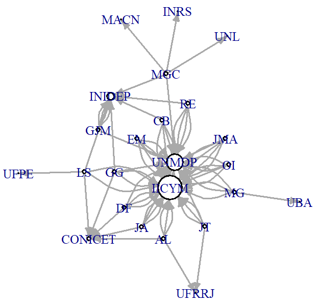 La baja colaboración internacional de los investigadores demuestra una autonomía científica de los mismos, por lo que no requieren en estricto rigor socios externos para visibilizar sus investigaciones. En las redes de colaboración se visualiza que el tamaño del nodo (círculo) y el número de conexiones (líneas), poseen una relación proporcional al grado de colaboración existente, entre investigadores, entre investigadores con otros centros, y entre investigadores con los diferentes países. En general, los resultados de estas redes de colaboración sugieren una tendencia a que los investigadores más productivos de cada CIM tienden a colaborar con otros que poseen también una amplia red de colaboración. En particular, las colaboraciones entre investigadores mexicanos y argentinos están orientadas a trabajar con sus pares del mismo centro y país, por lo que han generado un relativo aislamiento necesitando transitar hacia procesos de internacionalización. Es importante considerar que en esta investigación se analizó la estructura de la red interna de colaboración de los investigadores más productivos, limitando el análisis de los menos productivos, por lo que pueden verse invisibilizadas algunas conexiones entre investigadores del mismo centro, y tener implicancias en la productividad de algún investigador.