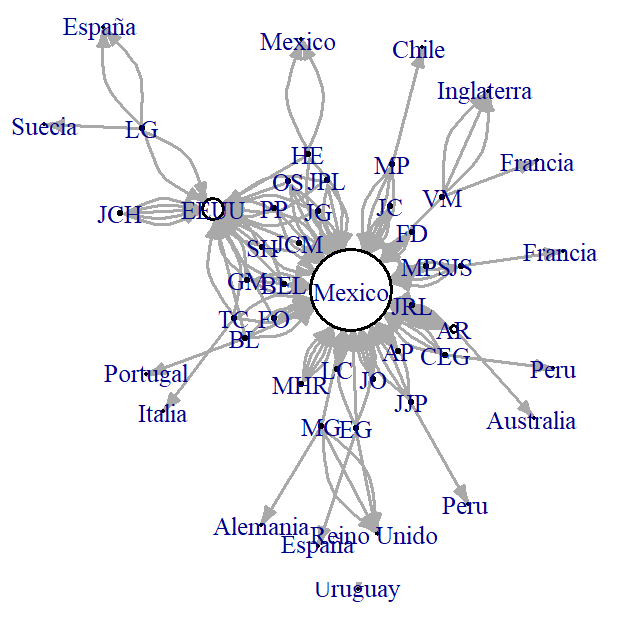 Para el análisis de las redes de colaboración entre investigador/investigador e investigador/centro se consideraron de manera arbitraria solamente a los cinco primeros colegas- investigadores que pueden o no pertenecer a cada uno de los CIM, con los cuales publican en mayor cantidad los investigadores aquí analizados. Para las redes de colaboración entre investigador/país, se consideraron las naciones también de los mismos cinco primeros colegas-investigadores con mayor colaboración de artículos. Se tomaron en cuenta los cinco primeros debido a que los investigadores más productivos tienden a colaborar mayormente con otros investigadores que a su vez poseen grandes redes de colaboración (Newman, 2004). Además, la colaboración se ve mayormente estimulada por los recursos en común de financiamiento para llevar a cabo sus investigaciones, y finalmente porque los investigadores tienden mayormente a trabajar con colegas especializados en su mismo campo de experiencia (Iglič, Doreian, Kronegger & Ferligoj, 2017).