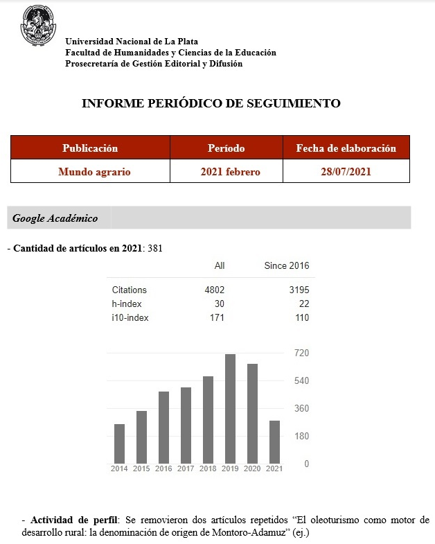 A continuación, se incluye un ejemplo concreto del diseño de dicho informe aplicado a la revista Mundo agrario (Figuras 1, 2, 3 y 4).