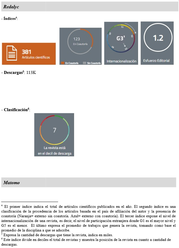 Índice de internacionalización (El nivel de internacionalización de una revista permite observar el nivel de participación extranjera, y está conformado por cinco grupos e igual número de subgrupos. El nivel más alto de internacionalización está definido por G1 y el de menor G5. El índice se deriva de tres variables con diferentes pesos: 1. Proporción (%) de autores extranjeros (valor 0.25); 2. Número de países extranjeros (valor 0.35); Proporción de artículos con al menos un autor extranjero (valor 0.45). El Grupo G1 indica el mayor nivel de internacionalización y el G5 el de menor internacionalidad o mayor endogeneidad. Pareció importante la creación de los subgrupos, ya que G2 indica que está muy cerca del G1, mientras G2 indica que está mucho más cerca del G3 y con probabilidades de descender de grupo.)
