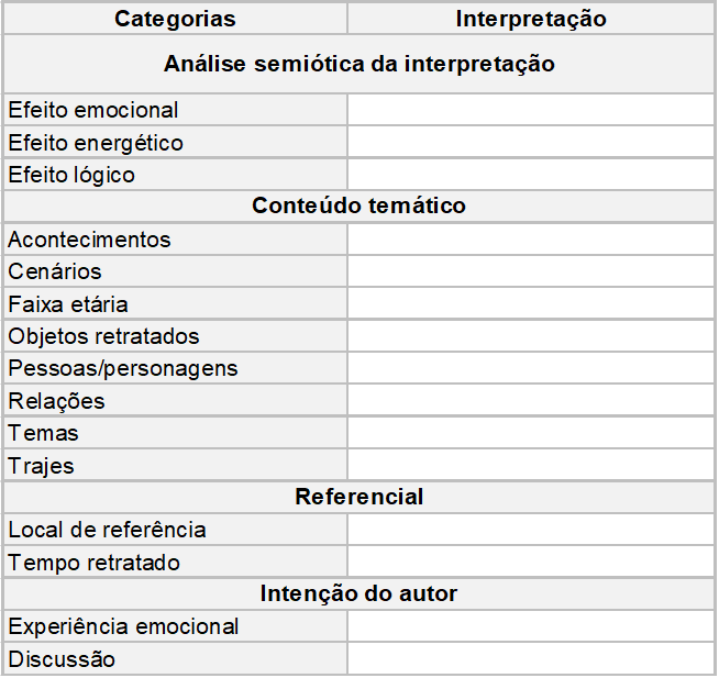 Ribeiro & Cordeiro (2007) desenvolveram uma pesquisa de representação documentária de caricatura,2 baseada na proposta de análise de imagens de Shatford (1986). Os critérios propostos nesse modelo de análise, apresentado no Quadro 1, dizem respeito aos aspectos intrínsecos à caricatura, divididos em: conteúdo temático, aspectos referenciais e intenções do autor.