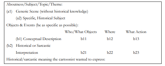 A proposta de Wu (2013), por sua vez, é voltada ao esquema de indexação de charges, baseando-se nas pesquisas desenvolvidas por Panofsky (1991) e Shatford (1986). Esse esquema divide-se em três campos principais: descrição geral, descrição histórica e sarcástica, e significado histórico e sarcástico. Conforme apresentado na Figura 1, os campos a1 e b1 (b11, b12, b13) são campos de descrição geral, que correspondem ao nível pré-iconográfico de Panofsky (1991); os campos a2 e b2 (b21, b22, b23) são campos de descrições históricas / sarcásticas que correspondem ao nível iconográfico.