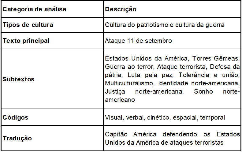 Como elementos semióticos que caracterizam a cultura do autor, na análise da história em quadrinhos “Capitão América: o novo pacto”, identificou-se a presença da cultura do patriotismo e da guerra ao longo da narrativa. Depreende-se a presença destes elementos posto que a cultura material remete ao patriotismo, caracterizada no uniforme do Capitão América e na bandeira dos Estados Unidos da América, presente em vários quadros durante a história. O próprio Capitão América se configura como um símbolo dos valores culturais e políticos norte-americanos. Outras características da cultura material são as armas, bombas, minas, granadas, facas, cidades devastadas, explosões e mísseis que aparecem ao longo da narrativa representando a guerra. A cultura imaterial, por sua vez, se constitui a partir de um conjunto de códigos e elementos que caracterizam as formas de pensar e o modo de agir dos personagens da história em quadrinhos: medo, desconfiança e pavor do diferente e de países exteriores (xenofobia); raiva, dor, luto e sentimento de impotência expressa nos diálogos e fisionomia dos personagens; críticas de cunho político em relação ao governo George W. Bush e à guerra ao terror e diante da comemoração de 4 de julho (Independência dos Estados Unidos).9
