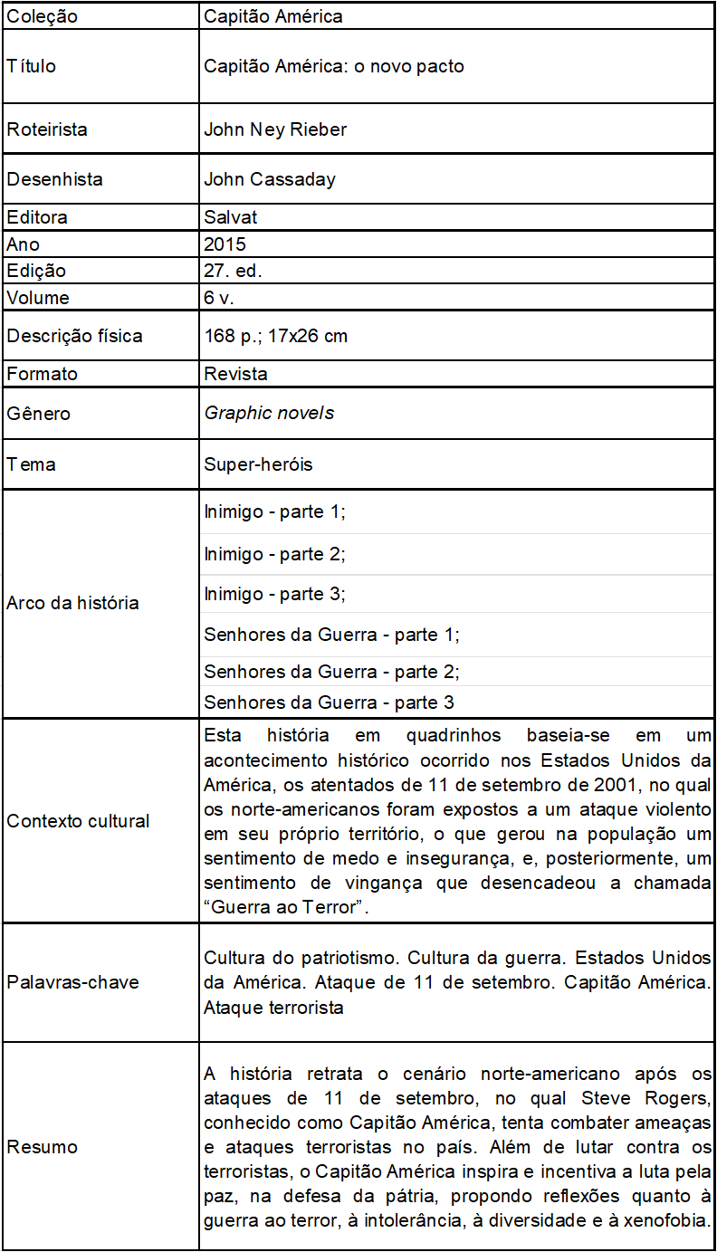 Destaca-se que o exemplo selecionado para compor este artigo, a revista “Capitão América: o novo pacto” integra o álbum de histórias em quadrinhos do Capitão América. Os arcos da história (capítulos) foram, inicialmente, publicados separadamente em revistas periódicas da Marvel,12 em seis volumes. Posteriormente, esses volumes foram publicados em uma única revista.