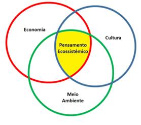 Em sua fala, ressalta o homem como o sistema mais evoluído de todos, um sistema complexo, rico e consequentemente aberto e sob essa perspectiva, propõe ainda a ideia de um ecossistema social que chama de ecossistema sócio-urbano, conformado pela sociedade moderna vista a partir de um olhar ecológico onde estão presentes os indivíduos, os grupos, as instituições, entre outros (Morin, 1984, p. 98) devendo buscar a manutenção de uma relação centrada no equilíbrio integrado: cultura, meio ambiente e economia (Figura 1).