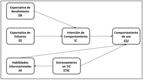 El diseño del estudio incorporó un modelo de investigación (ver Figura 1) basado en el UTAUT (Venkatesh et al., 2003), expresado en un instrumento estructurado en una encuesta que incorpora los siguientes constructos como factores que influyen en la variable Comportamiento de Uso (CU): las variables Intención de Comportamiento (IC), expectativa de Rendimiento (ER) y Expectativa de Esfuerzo (EE). El instrumento adicionalmente incorpora las Condiciones Facilitadoras (CF), expresadas a través la variable Habilidades Informacionales (HI) y la variable Entrenamiento en TIC (ETIC). Cabe recordar que ambas variables en su conjunto representan la alfabetización informacional.