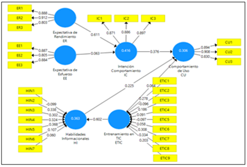 Ya planteada la necesidad de adquisición de habilidades y competencias en la era digital por parte de los estudiantes, y acentuada en tiempos de Covid-19 (Cotino, 2020; Marín-Gutiérrez et al., 2020), la alfabetización informacional se reposiciona como “un derecho humano básico en el mundo digital” (IFLA, 2005). En esta línea los resultados de las pruebas estadísticas de esta investigación informan que la alfabetización informacional es una condición facilitadora (CF) que influye en el comportamiento de uso de los recursos de búsqueda y recuperación de información por parte de los estudiantes universitarios, lo que alimenta la teoría de Salazar & Ramírez (2014), quienes por primera vez proponen las Habilidades Informacionales (HI) y el Entrenamiento en TIC (ETIC) como factores que explican la aceptación y uso de las TIC por parte de los estudiantes universitarios. Sumado a este estudio, Salazar et al. (2019) no solo ratifican la influencia de las habilidades Informacionales (HI) y Entrenamiento en TIC (ETIC), como factores influyentes en el uso de las TIC; sino que además, ambos estudios realizados en el modelo TAM (Davis, 1989), correspondiente a la versión anterior del modelo UTAUT (Venkatesh et al., 2003), informan uno de los principales hallazgos de este estudio, que el entrenamiento en TIC influye en el modelo solo a través de las Habilidades informacionales (HI), lo que permitió aceptar parcialmente la Ha2 (Tabla 7).