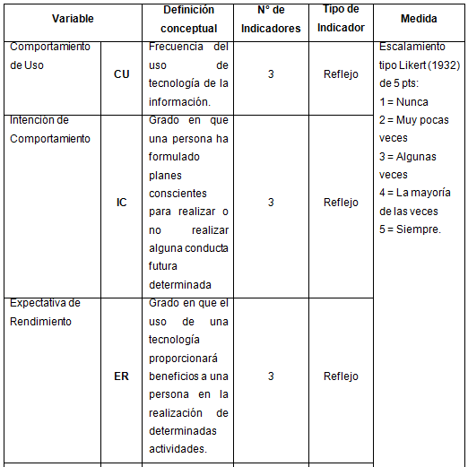La alfabetización o adquisición de conocimientos básicos sobre información y TIC, es señalado como uno de los tipos de aprendizaje que se necesitan en el siglo XXI, siendo un componente esencial del pensamiento crítico (Scott, 2015). La alfabetización informacional, expresada a través de habilidades informacionales y entrenamiento en TIC, se identifica como influyente del uso de recursos de búsqueda y recuperación de información en el estudiante universitario (Salazar & Ramírez, 2014; Salazar et al., 2019) tornándose una condición facilitadora para modificar el comportamiento de uso de estas TIC en los estudiantes. En este ámbito, Venkatesh, Morris, Davis & Davis (2003) propusieron un modelo para explicar el comportamiento de uso de una TIC denominada Teoría Unificada de la Aceptación Tecnológica (UTAUT), que propone que la intención de uso de la tecnología (IC) es influenciado por la Expectativa de Rendimiento (ER), la Expectativa de Esfuerzo (EE), y la Influencia Social (IS), de igual manera, el Comportamiento de Uso de la tecnología (CU) es influenciado por la IC y las condiciones facilitadoras (CF). La definición conceptual de estas variables, su n° de indicadores y su forma de medición en el instrumento puede visualizarse en la matriz de operacionalización de variables (Tabla 1).