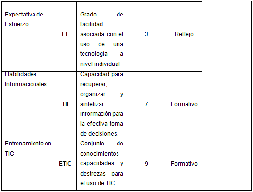 Uno de los hallazgos del estudio que propone el modelo UTAUT (Venkatesh et al., 2003), fue que la variable influencia social es relevante solo en ambientes donde el uso de la tecnología es obligatorio y solo cobra significatividad en ambientes donde el uso de la TIC es libre. Fundamentados en esto y dada la libertad en el uso de las bases de datos científicas por parte de los estudiantes, se ha suprimido la variable IS. Además, considerando la evidencia (Salazar & Ramírez, 2014; Salazar, Paredes, Obando & Ourcilleon, 2019), se ha definido como CF a la alfabetización informacional, expresada a través de las Habilidades Informacionales (HI), y el Entrenamiento en TIC (ETIC), ambas definidas conceptualmente en la Tabla 1.