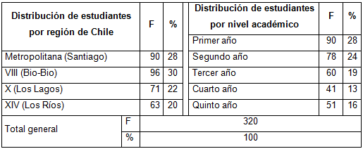 La muestra se compone de un n de 320 estudiantes, todos pertenecientes a una carrera del área de la salud. Los análisis de frecuencia (F) y porcentaje (%) permitieron conocer la distribución de estudiantes por regiones de Chile y por nivel académico (Tabla 2). Del total, 248 estudiantes son mujeres (78%) y 70 son hombres (22%). La edad promedio es de 27 años, y las frecuencias de edad más altas son 21 (47 estudiantes) y 22 (47 estudiantes). Un 73% (232) de los estudiantes informa que solo estudia, mientras que un 28% (88) trabaja y estudia. Del total de los estudiantes, 182 provienen de educación media subvencionada correspondiendo a un 57% de la muestra, 98 (31%) estudiantes provienen de educación pública o municipal, y 39 (12%) de educación privada. En cuanto a su educación básica, la frecuencia y % son los siguientes: 164 (51%) educación subvencionada, 107 (33%) pública y 49 (15) estudiantes proviene de educación privada.