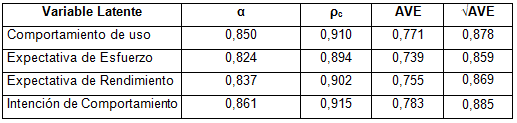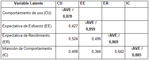 El análisis de la Varianza Extraída Media (AVE) arrojó que todos los indicadores reflejos (Tabla 1) obtuvieron valores > 0,5 (Tabla 3).