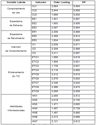 El análisis de Outer loading arrojó todas las cargas λ > 0,70, lo que indica que se aceptan los valores (Tabla 5).