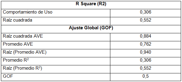 El Análisis de Ajuste Global, arrojó un GOF > 0.6, indicando un adecuado ajuste global. El R2 es aceptado con un valor mayor a > 0,1 (Tabla 6).
