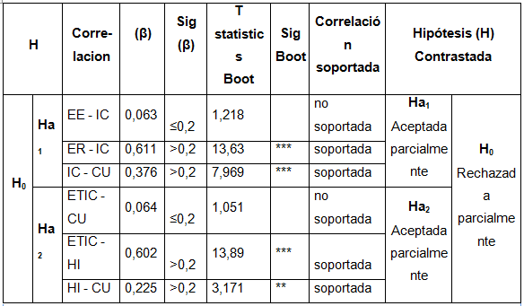- Hipótesis alternativa 2 (Ha2): Las variables HI y ETIC, influyen en el comportamiento de uso de recursos de búsqueda y recuperación de información en el proceso de enseñanza-aprendizaje, por parte de los estudiantes universitarios.