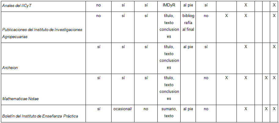 Para las siete revistas restantes, más de la mitad de las creadas durante el periodo analizado, se propone trabajar en la categoría de revistas científicas pioneras (revistas pioneras, en adelante), con la intención de subrayar su carácter inaugural en el camino de las publicaciones de este tipo en la institución. Se trata de las publicaciones Anales de la Facultad de Ciencias de la Educación (1923), Universidad (1935), Anales del IICyT (1932), Revista del Instituto de Experimentaciones Agropecuarias (1930), Revista del Instituto de Investigaciones Microquímicas (1936), Archeion (1940) y Mathematicae Notae (1941). Un aspecto central de este primer análisis es que, con excepción de los Anales de la Facultad de Ciencias de la Educación, dependiente de la facultad homónima, las publicaciones de aquella etapa fueron creadas casi a la par de los institutos de investigación que les dan su nombre.
