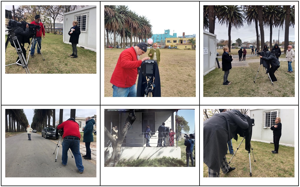 La experiencia, desarrollada en el segundo semestre del año 2022, se configuró en cinco fases. En la primera de ellas, se propuso la integración de los múltiples participantes (estudiantes, docentes y un grupo de adultas mayores integrantes de la comunidad del barrio Cerro de Montevideo) a través de actividades lúdicas integradoras que permitieron reunirse en la empatía y la identificación en un objetivo común. La fase dos se construyó sobre el relato oral de la memoria, de aquello que resultó significativo y se imprime en el presente a través del testimonio por razones diversas asociadas a las emociones, los afectos y las necesidades personales. Se configuraron subgrupos de trabajos, integrados por estudiantes y adultas mayores, en los cuales se desarrollaron actividades centradas en los relatos con distintos abordajes didácticos que involucraron aspectos lúdicos, entrevistas y visitas domiciliarias. Así, se fueron constituyendo los primeros guiones colaborativos con múltiples miradas y a partir de los aportes integrales de las estudiantes de distintas disciplinas. En la tercera fase se involucraron los archivos fotográficos personales. Sobre ellos, las adultas mayores compartieron sus testimonios que configuraron la memoria y la historia de las fotografías de archivo que se pusieron en juego con el relato anterior dando lugar a una resignificación. Cada subgrupo, de forma autónoma, fue desarrollando estrategias propias de trabajo centradas en la articulación de la memoria, el archivo y el lenguaje de la imagen dando lugar a una reconstrucción de la identidad colectiva en el intercambio permanente. Durante el desarrollo de estas tres fases y de forma paralela a las actividades descritas, docentes y estudiantes abordaron las distintas técnicas fotográficas pasando desde el colodión húmedo, el gran formato, el formato medio y la fotografía digital. Esto permitió tomar contacto con el desarrollo creativo de distintas técnicas y sus lenguajes propios, así como transitar por un proceso de producción análogo a las fotografías de archivos compartidas por las adultas mayores. A través de estas fases se construyeron los retratos asociados a la elección de una técnica fotográfica a través de la cual finalmente se realizó el registro de la imagen. Las siguientes figuras 2, 3, 4 y 5 ilustran estas primeras etapas de la experiencia: