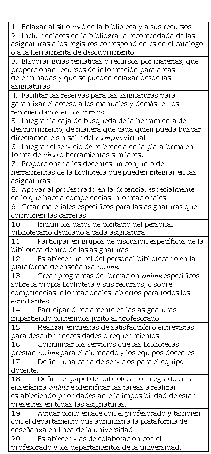 A este enfoque de modelos, pueden sumarse los aportes que ya en 2006 realizaban Horta García & Caballos Villar sobre un estudio de casos. En su trabajo detallaban la metodología aplicada para vincular a la Biblioteca de la Facultad de Ciencias Económicas y Empresariales de la Universidad Complutense de Madrid. Coinciden, en varios aspectos, con lo señalados años más tarde por les autores más arriba citades, Arroyo-Vázquez & Gómez Hernández (2020b), quienes enumeran y reflexionan sobre veinte formas de integrar a la biblioteca académica en la educación en línea. Ellas son las que se puntualizan en el cuadro 1:
