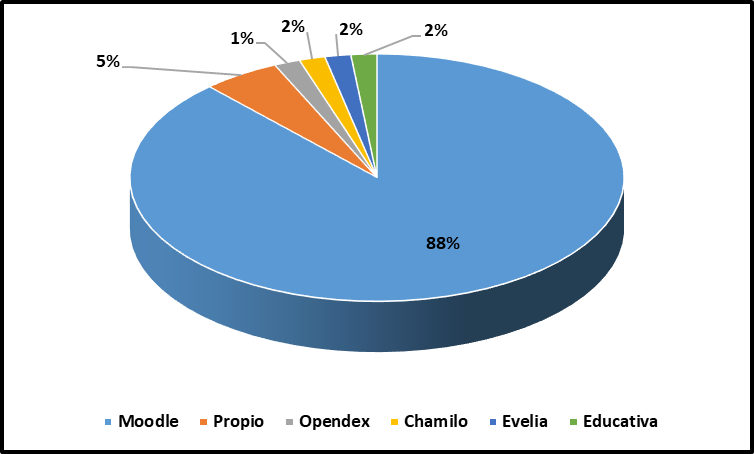 En cuanto al software utilizado en estas plataformas, la mayoría de ellas usan Moodle (88%),1 seguidos de softwares propios (5%), mientras que Chamilo,2Evelia,3 y E-ducativa,4 cada uno representa un 2% de la población abordada, y, por su parte, en menor medida, está Opendex (1%)5, tal como se visualiza en el gráfico 2.