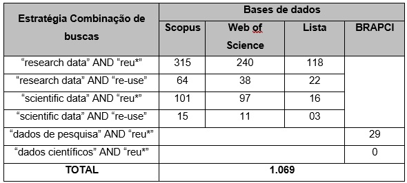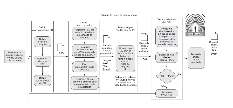 A composição do banco de artigos brutos abarcou a definição dos eixos de pesquisa e das palavras-chave, as combinações de busca e a seleção das bases de dados. Foram definidas duas bases multidisciplinares, a Scopus e a Web of Science (WOS) e duas bases de dados específicas da área da Ciência da Informação, a Library Information Science & Technology Abstracts with full text (LISTA) e a Base de Dados Referenciais de Artigos de Periódicos em Ciência da Informação (BRAPCI). O critério de seleção das bases se baseou na cobertura temática, na disponibilização de ferramentas de busca que abrangiam operadores booleanos, na possibilidade de realizar o refinamento dos resultados e na importação dos registros para software gerenciadores.