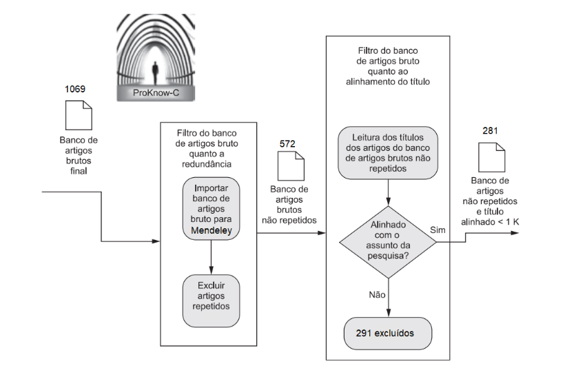 Os 1.069 registros recuperados que compuseram o banco de artigos brutos foram exportados para o gerenciador bibliográfico Mendeley, onde foram identificados os registros duplicados. A exclusão desses registros gerou um conjunto com 572 registros que passaram a compor a atividade de leitura dos títulos, que identificou que 291 registros não possuíam alinhamento com o tema da pesquisa, restando 281 trabalhos.