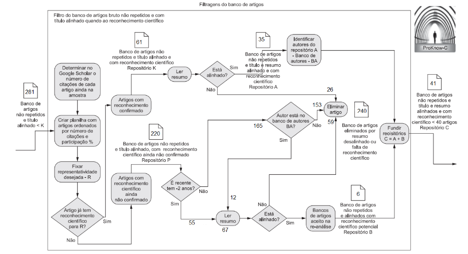 Os 220 artigos que não possuíam reconhecimento científico, ou seja, aqueles que corresponderam a apenas 19,17% das citações, conforme Teorema de Pareto, passaram por um processo de reconsideração, cujas condições para fazerem parte do portfólio da pesquisa, era que precisavam ter sido publicados há menos de 2 anos, dado que não tiveram possibilidades de serem bem citados ainda e que os artigos publicados há mais de 2 anos, devessem ser de autoria de algum pesquisador já presente no grupo dos artigos com reconhecimento científico e com alinhamento ao tema (Lacerda, Ensslin & Ensslin, 2012). Após essa etapa, 6 artigos foram adicionados ao banco de artigos não repetidos, mas alinhados com título e resumo e com reconhecimento científico potencial. A Figura 4 sintetiza todas as etapas envolvidas na filtragem dos artigos com base no alinhamento da pesquisa.