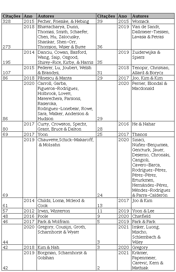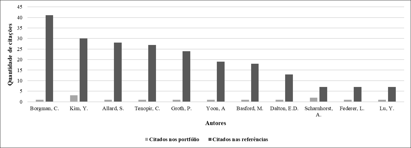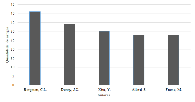 Dentre os 5 autores mais citados Christine Borgman recebeu 41 citações, Joshua Denny recebeu 34 citações, Youngseek Kim recebeu 30 citações, Suzie Allard e Mike Frame receberam 28 citações cada. Pode-se observar que dos 5 autores mais citados nas referências, Youngseek Kim é o autor que mais concentra publicações no portfólio bibliográfico.