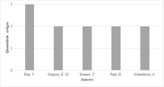 Pode-se observar que Youngseek Kim foi o autor mais relevante no portfólio com 3 artigos publicados, Kathleen Gregory, Thomas Kramer, Hyoungjoo Park e Andrea Scharnhorst, possuíam 2 artigos, os demais autores não apresentados na Figura 5 possuíam apenas 1 artigo publicado no conjunto de artigos selecionados.