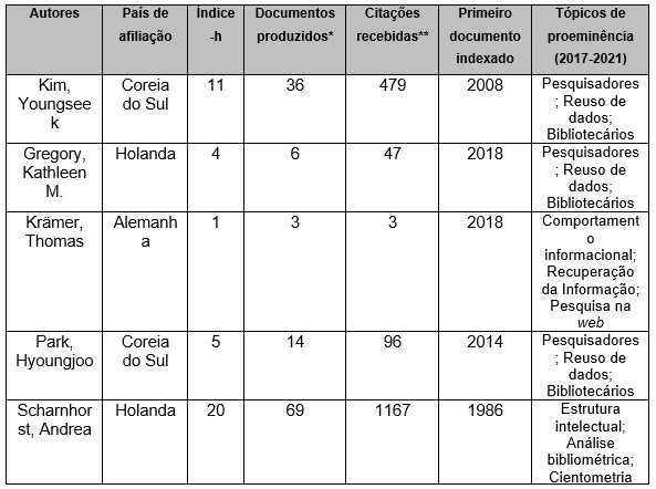 A partir da base de dados Scopus, foram levantadas algumas características dos autores de destaque, as quais estão sintetizadas no Quadro 3.