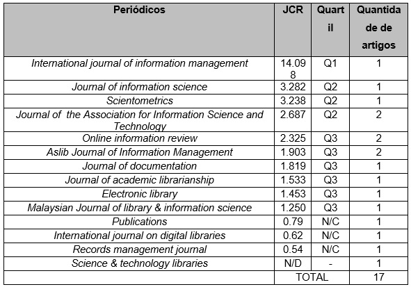 Pode-se observar ainda que o tema tem começado a ganhar visibilidade na Ciência da Informação, uma vez que a maioria deles tem se concentrado nos periódicos situados no quartil 3.