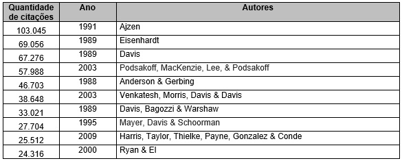 Quanto ao reconhecimento científico, os 10 artigos mais citados estão descritos no Quadro 6 e as referências arroladas no Apêndice B.