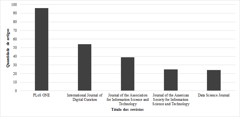 Dos periódicos citados, a PLOS ONE teve 96 artigos publicados, o International journal of digital curation, foi citado por 54 artigos, o Journal of the Association for Information Science and Technology, foi citado por 39 artigos, o Journal of the American Society for Information Science and Technology foi citado por 25 artigos e o Data Science Journal foi citado por 24 artigos.