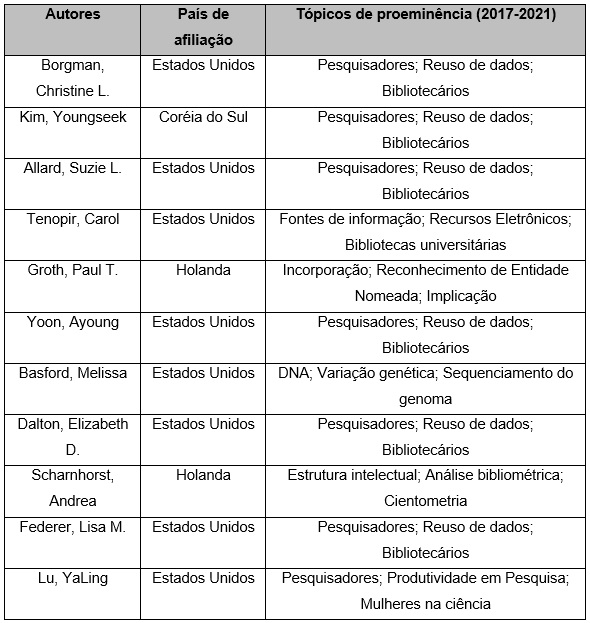 No entanto, ao se relacionar as características desses autores, conforme Quadro 8, pode-se observar que o país de afiliação se concentra nos Estados Unidos e que em 6 deles mantêm a proeminência de tópicos na área da reuso de dados, pesquisadores e bibliotecários. O que coincide com as análises já verificadas nos autores do portfólio.